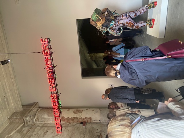 Das Künstlerkollektiv Claire Fontaine greift das zentrale Motiv der Biennale direkt auf. Ihre Arbeit Foreigners Everywhere / Stranieri Ovunque besteht aus einer Serie von Neon-Schriftzügen in unterschiedlichen Sprachen.